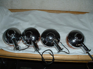 Le nettoyage des cabochons a pris un certain temps car certains étaient tachés de peinture noire, l'acétone a dilué ces taches, le produit à vaisselle a fait le reste. J'ai dû en changer deux qui étaient abîmés. Les ampoules (d'origine siouplaît) sont en parfait état, ce sont des 10W de marque Stanley. Lors du remontage les éléments oxydés ont été grattés. Seul un des 4 a un porte lampe différent mais en excellent état et parfaitement fonctionnel : j'ai laissé comme ça.